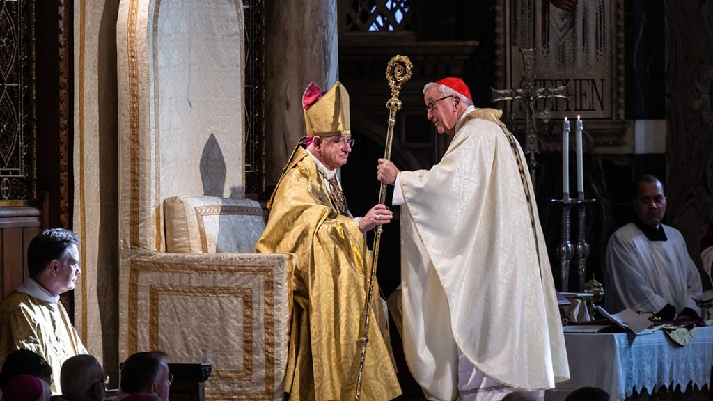 The provost then led Archbishop Moth to the throne. Former Archbishop of Westminster Cardinal Nichols passed him the crozier, the staff which symbolises the office of a bishop.