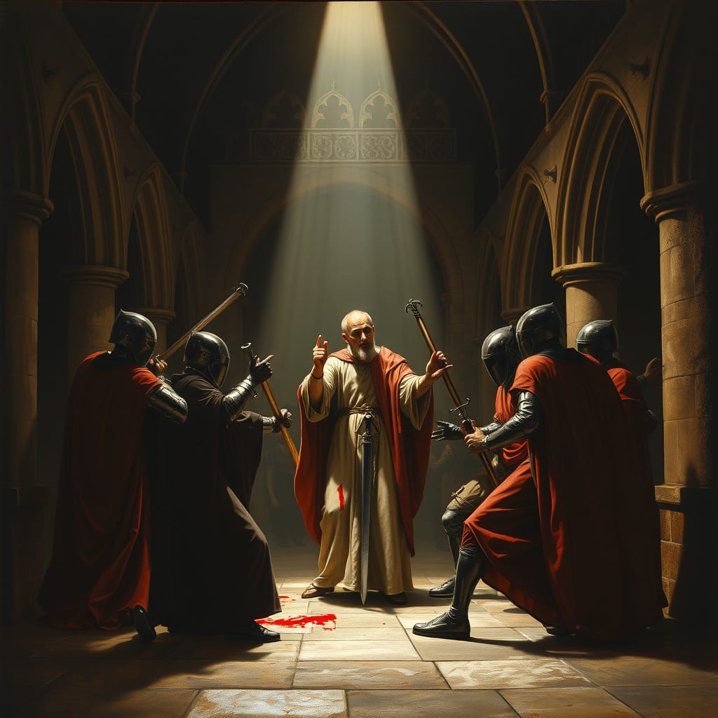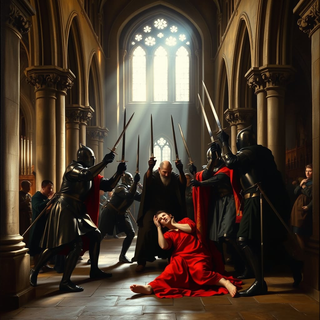 On December 29, 1170, the group arrived at the cathedral. According to reports from Gervase of Canterbury and the eyewitness Grim, the knights initially left their weapons and armor outside the cathedral gates before entering to request an audience with Becket. They sought to discuss his recent actions and urged him to accompany them to Winchester for clarification. However, Becket respectfully declined to leave the cathedral. When their request was not granted, the knights re-entered the cathedral with their weapons.