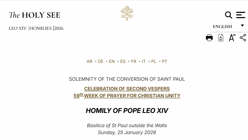 Pope Leo emphasized how different Christian religions share the same faith and encouraged them to continue together the mission of spreading the Gospel throughout the world, on Sunday, January 25, 2026, at the conclusion of the Week of Prayer for Christian Unity.