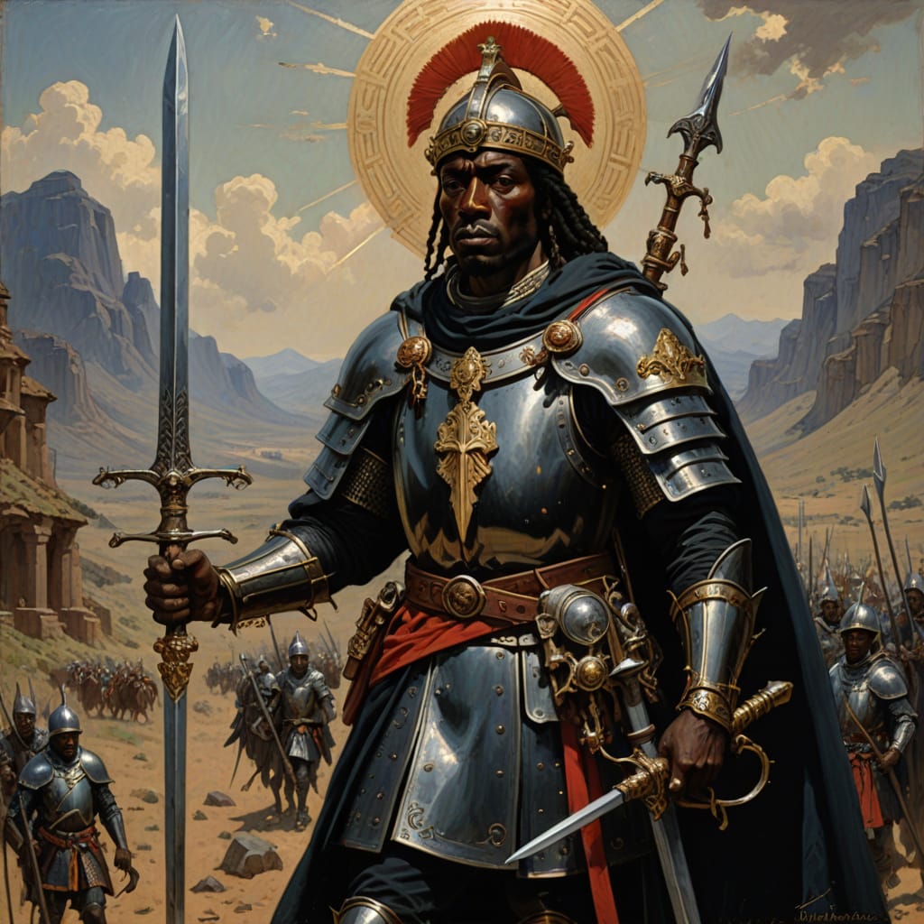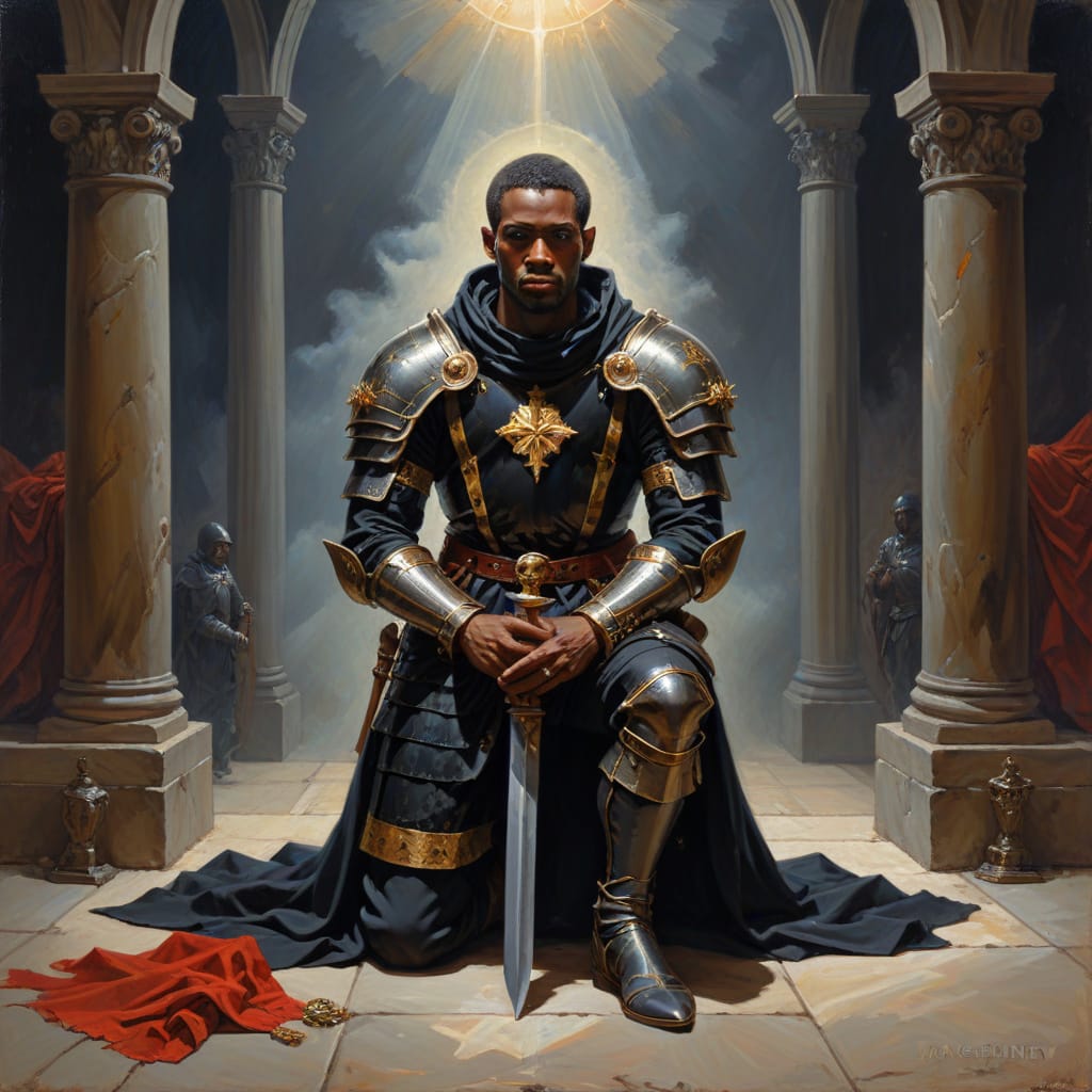 Feel the soul-stirring echo of their sacrifice reverberate through the ages! Their heroic refusal to kneel, to betray—an eternal flame that ignites hope in the hearts of nations! A symbol of loyalty unshaken, their story fuels the flames of courage in the bravest souls! To this day, Saint Maurice’s name resounds through halls of power and across generations—an eternal beacon inspiring empires to greatness! The Holy Roman Emperors, draped in grandeur and awe, bowed before relics of divine authority—his lance, his sword, his spurs—the sacred artifacts of eternity and divine justice! His armor, emblazoned with a blood-red cross, roars as a battle cry for warriors of faith—defenders of righteousness and hope!