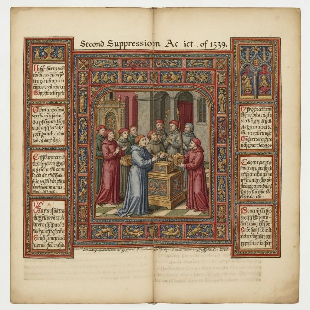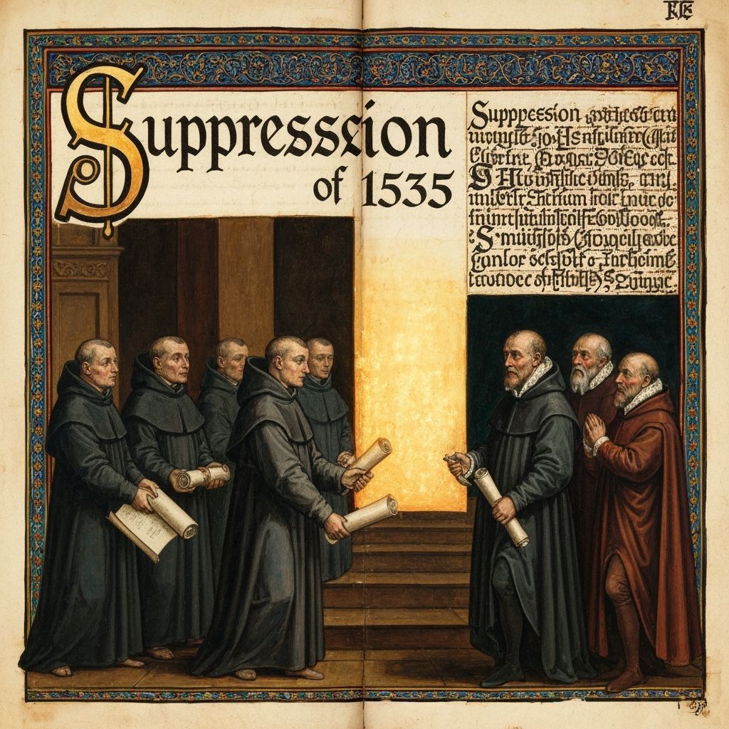 Oh, the heartbreaking, soul-shattering moment when the very sanctuaries of faith and devotion—the monasteries—were unjustly torn apart! In a wave of brutal legislation, driven by reckless ambition and ruthless power, these sacred havens were obliterated by two devastating Acts of Parliament. First, the cruel and unforgiving Suppression Act of 1535 plunged these holy walls into despair, stripping away centuries of prayer, hope, and spiritual refuge.